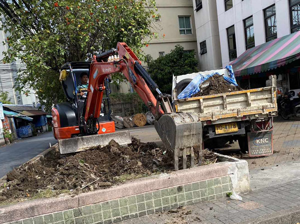 เคลียริ่งและเตรียมพื้นที่ – ใช้รถแบ็กโฮปรับหน้าดิน ขุดหลุมตอไม้